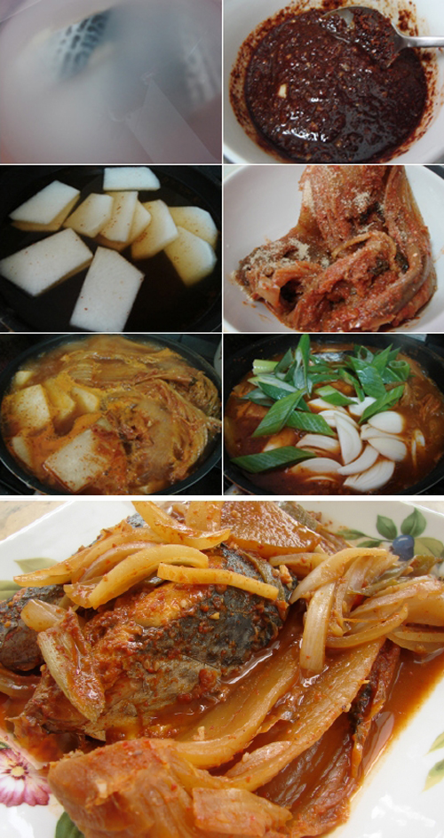 삼치,김치,멸치육수,대파,양파, 고추가루2, 간장2, 다진마늘1, 청주1, 맛술1, 물엿1,