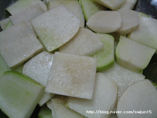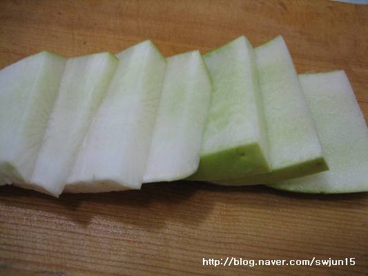 1. 무는 깨끗하게 씻은 후 넓적하게 썰어 놓아요.