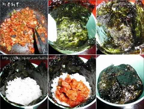 6. 밥 위에 볶은김치를 올리고 다시 밥을 한숟가락 올리고