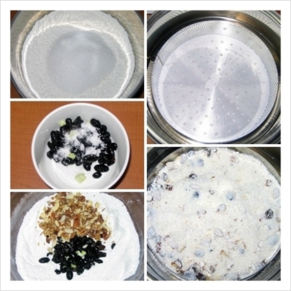 찹쌀가루 360g, 설탕 60g, 소금 1작은술, 서리태 30g, 건포도 30g, 견과류 60g
