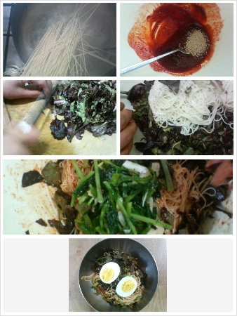 국수, 열무김치, 상추, 달걀, 양념 : 고추장, 참기름, 깨소금, 매실액기스, 식초,