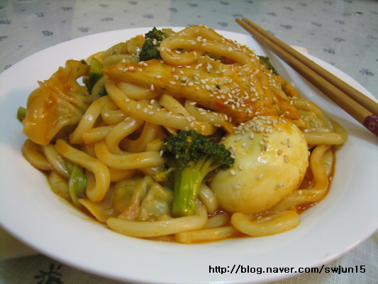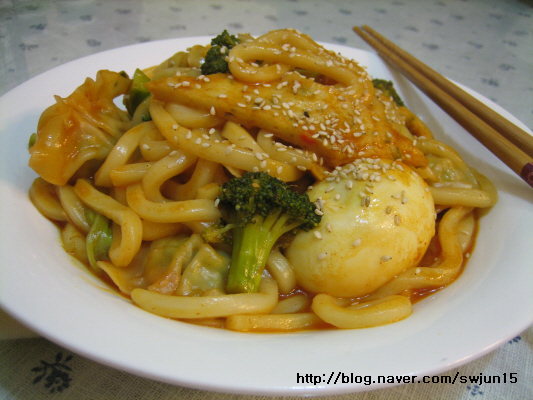11. 10의 우동사리와 달걀을 넣어서 볶은 후 참기름을 뿌린 후 골고루 섞어 줍니다.