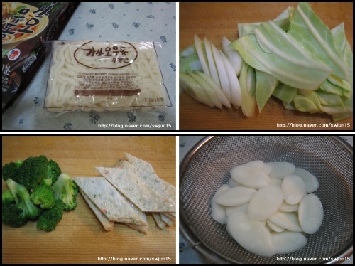 우동사리 1봉지, 냉동 물만두 17개, 달걀 3개, 떡국떡 한줌, 어묵 1장, , 양배추 1잎, 대파 1/2개, 브로콜리 한줌, 통깨 약간, 참기름 1큰술, 소금 약간