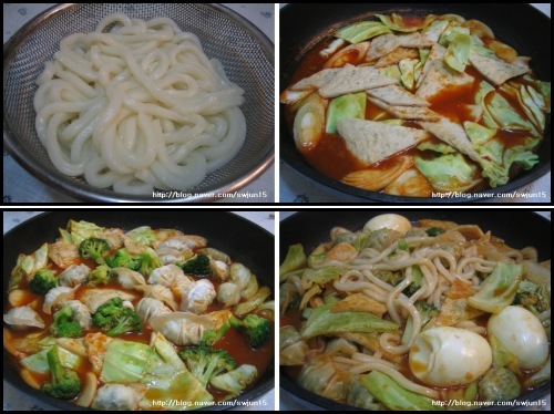 7. 끓는물에 우동사리를 삶은 후 체에 밭쳐 찬물에 헹군 다음 물기를 제거해 줍니다.