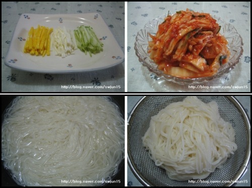 8. 넓은 볼에 소면을 담고 김치, 오이채, 양념장, 참기름, 통깨, 김치국물을