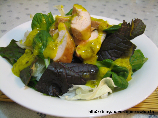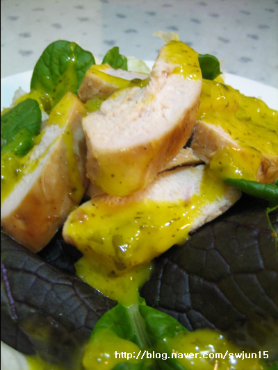 닭가슴살 3조각, 모둠쌈야채 120g, 양상추 적당량, 오이피클 머드타드소스 적당량, 우유 적당량 , 닭고기 양념 ( 양조간장 3큰술, 다진마늘 1큰술, 후춧가루 약간, 설탕 1작은술 )