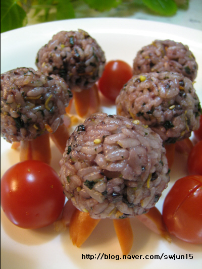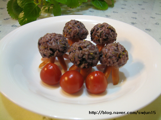 6. 접시에 꼴뚜기 모양의 주먹밥을 담고 방울토마토를 곁들여 냅니다.