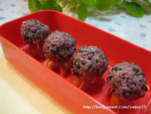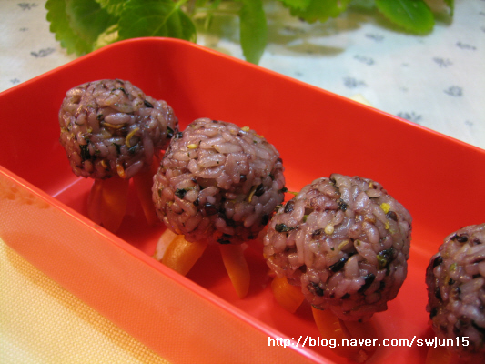 흑미밥 1공기 반, 밥이랑 해물 1봉지, 비엔나 소시지 17개,, 참기름 1큰술, 방울토마토 10개