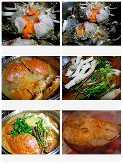 꽃게1kg,무우,새송이버섯,미나리,쪽파, 고추가루,된장,마늘,생강,소금
