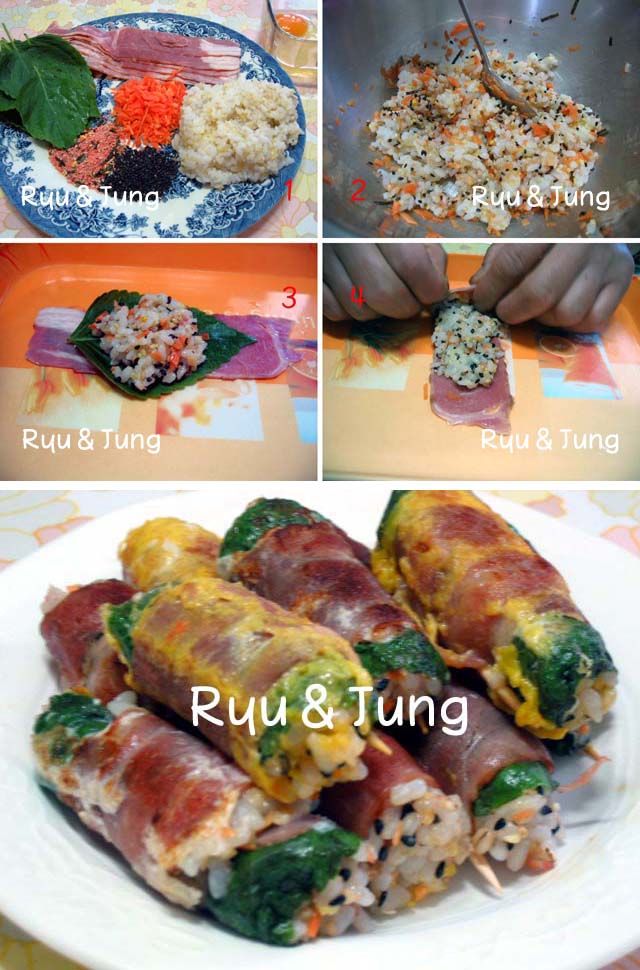 3 베이컨위에 깻잎을 얹고 그 위에 비벼둔 밥을 얹는다.