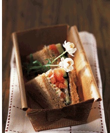 3. 식빵의 스프레드 바른 면에 미니 야채를 올린 다음 소스를 살짝 뿌리고 슬라이스 치즈를 한 장 올린 뒤 다른 식빵으로 덮어 무거운 것으로 눌러 놓았다가 삼각형으로 4등분하여 도시락에 담는다.
