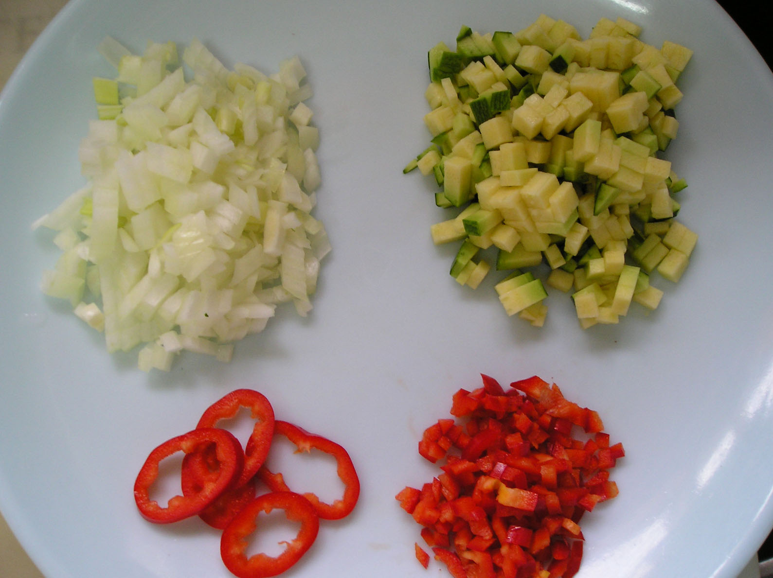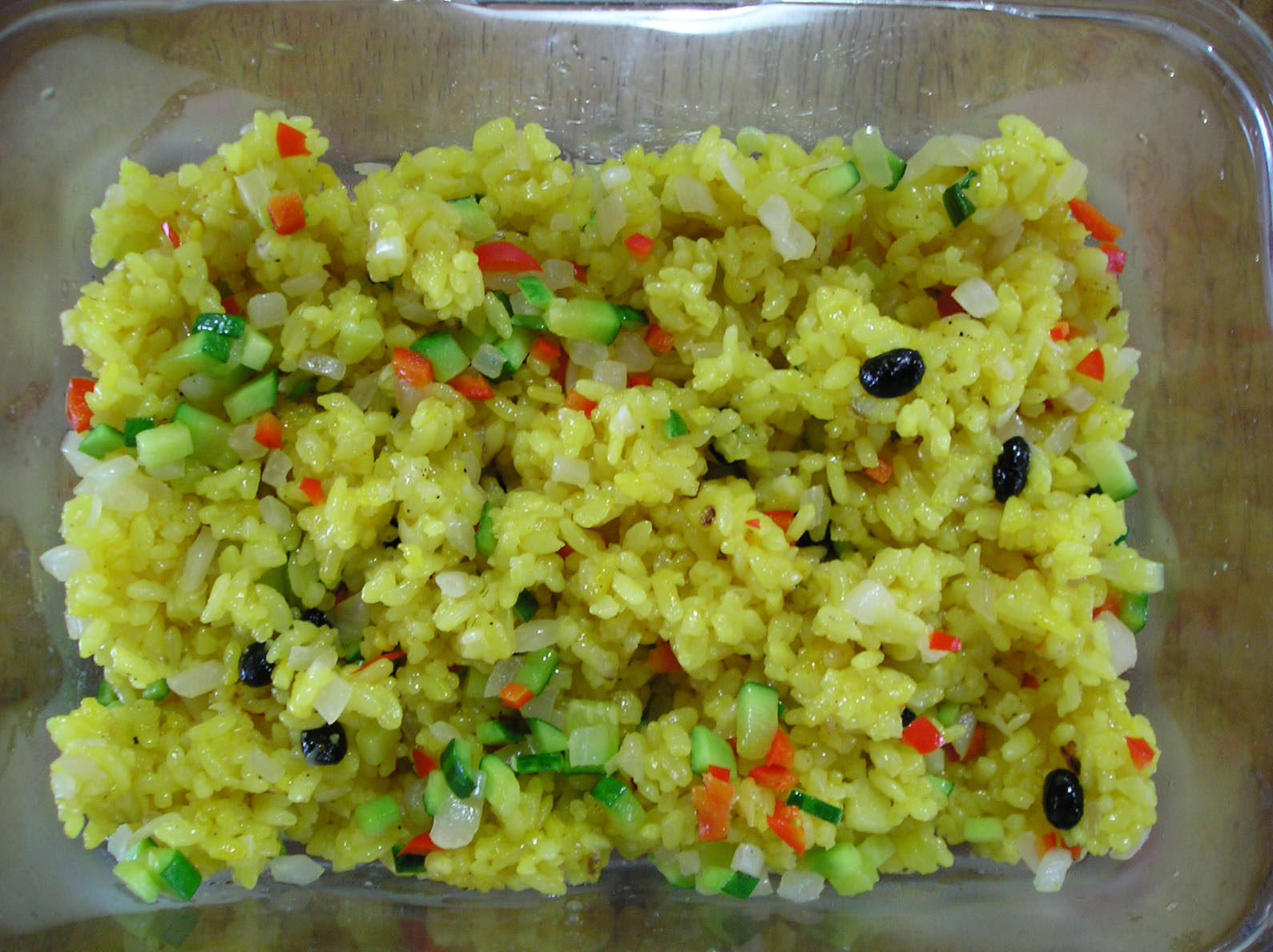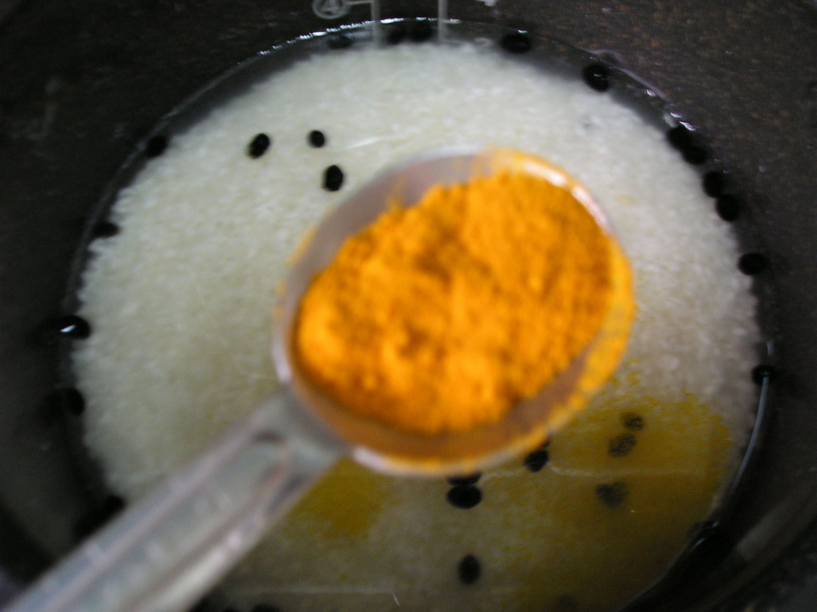 쌀 2인분, 양파, 호박, 파프리카, 콩. 강황가루, 식용유, 소금.