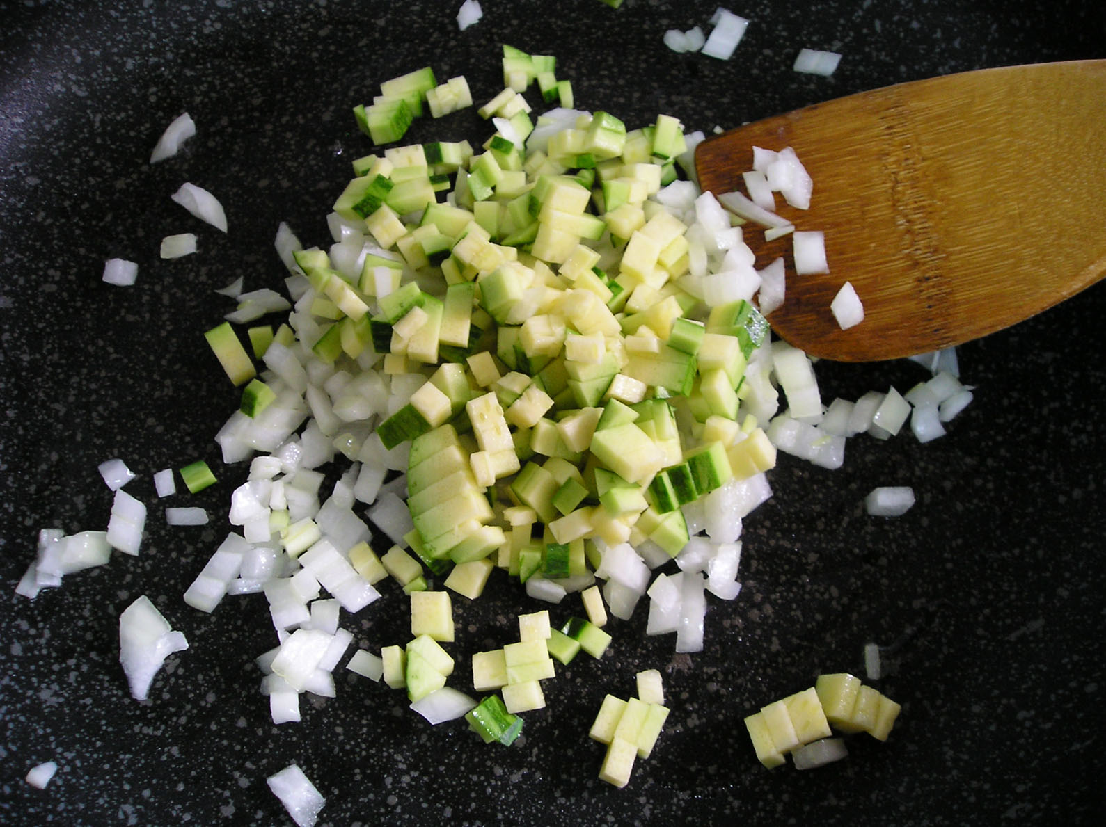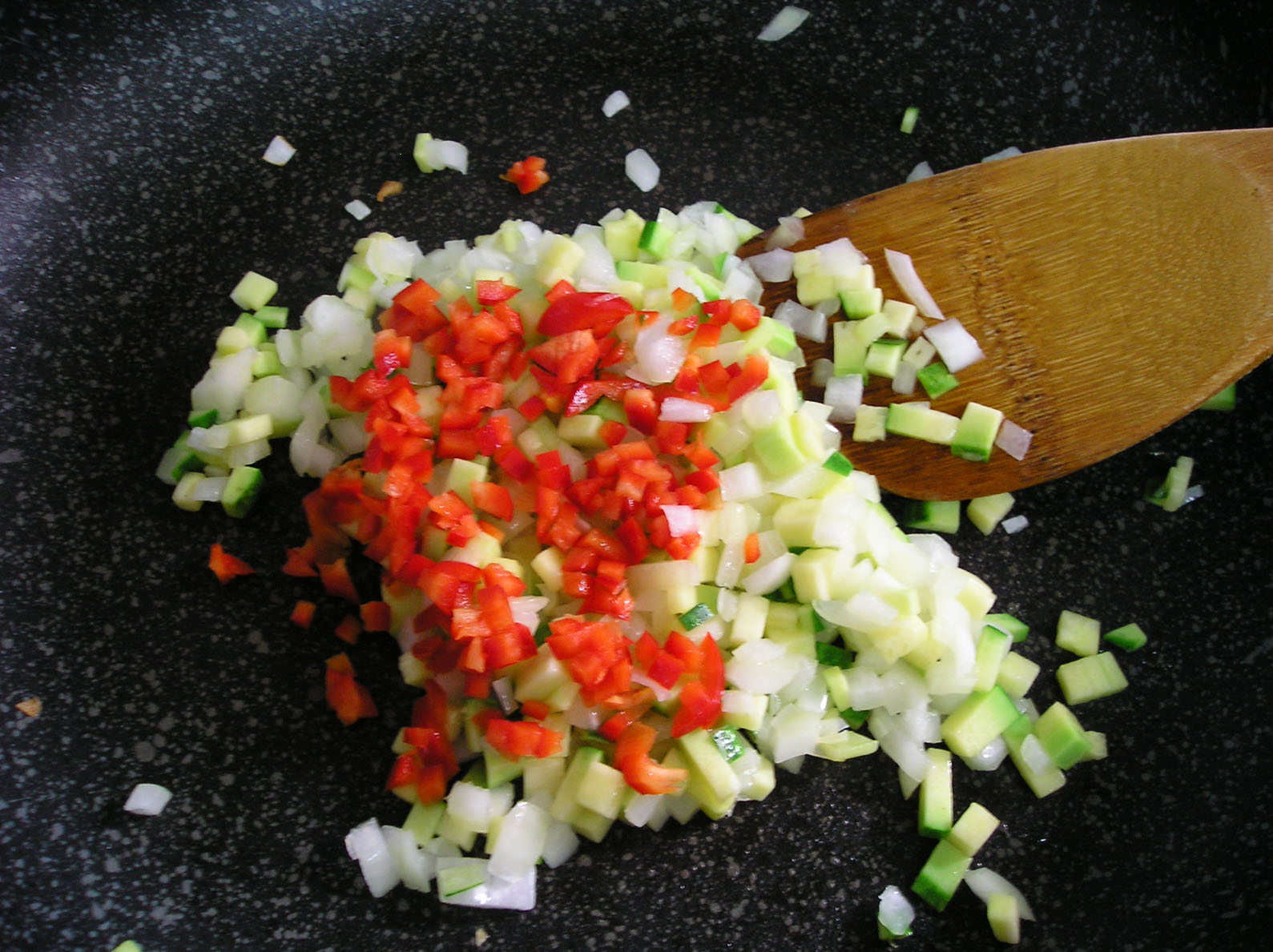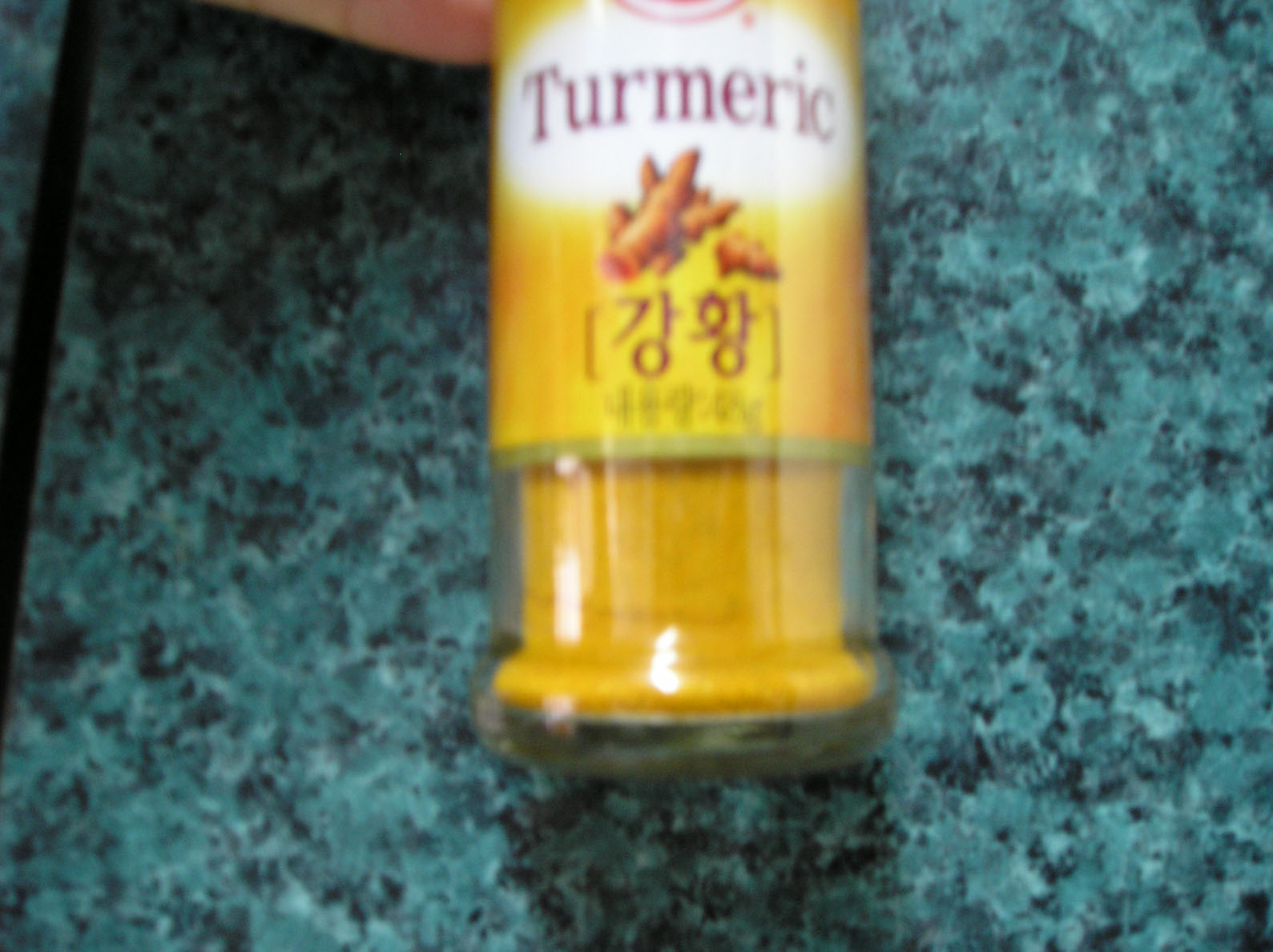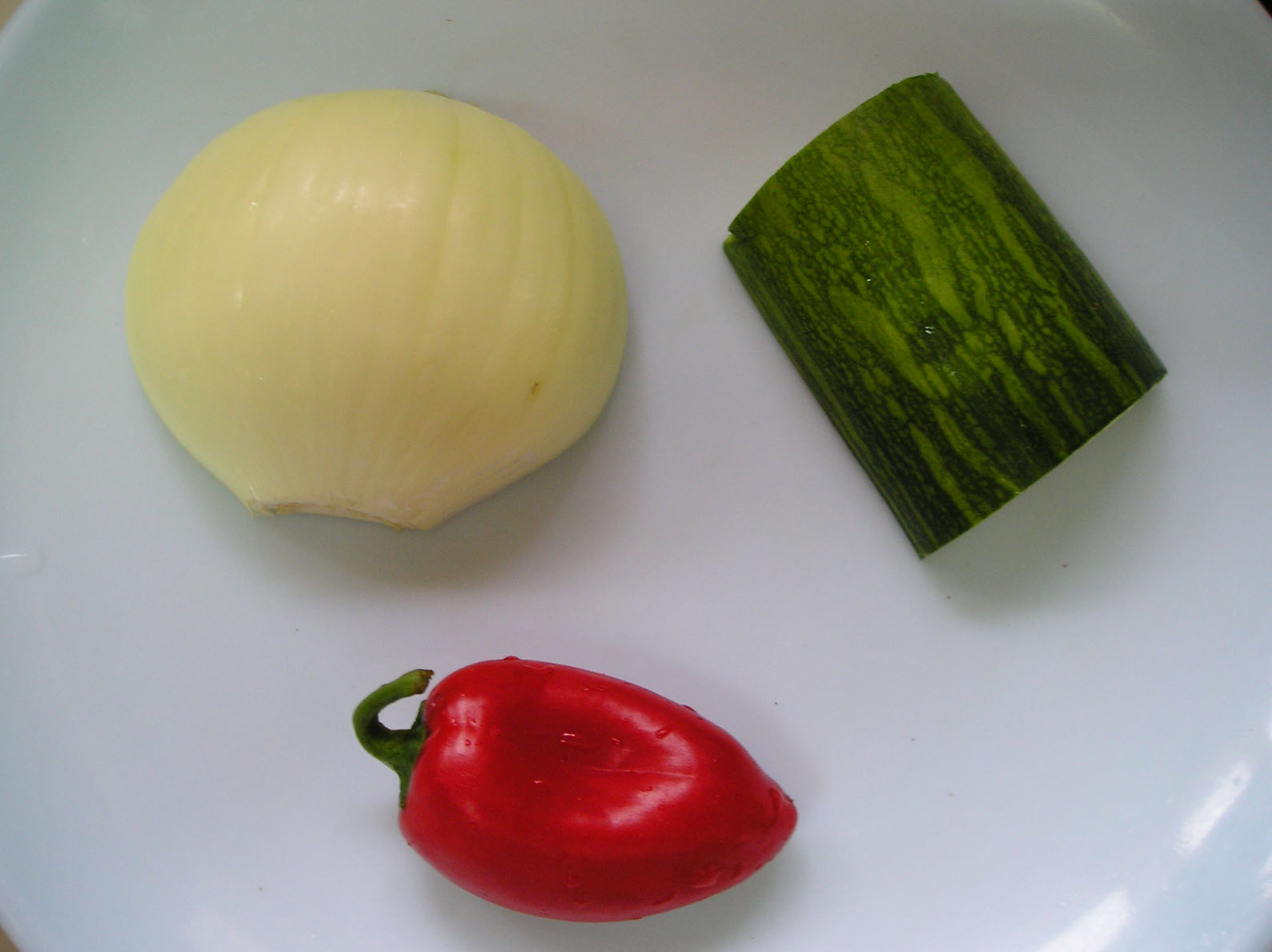 쌀 2인분, 양파, 호박, 파프리카, 콩. 강황가루, 식용유, 소금.