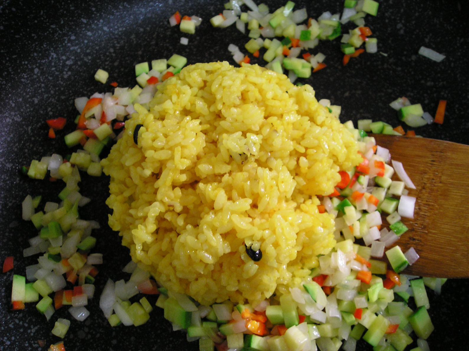 * 노란 밥을 넣고 볶는다. 소금으로 간한다.