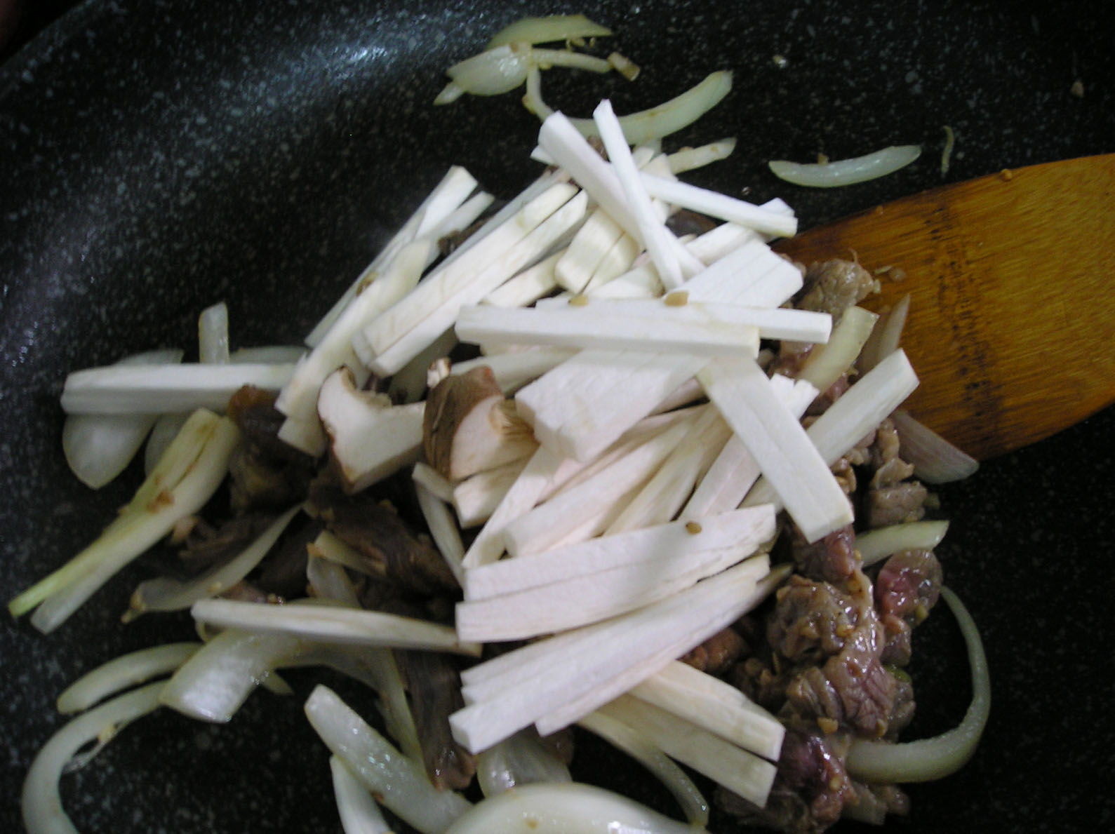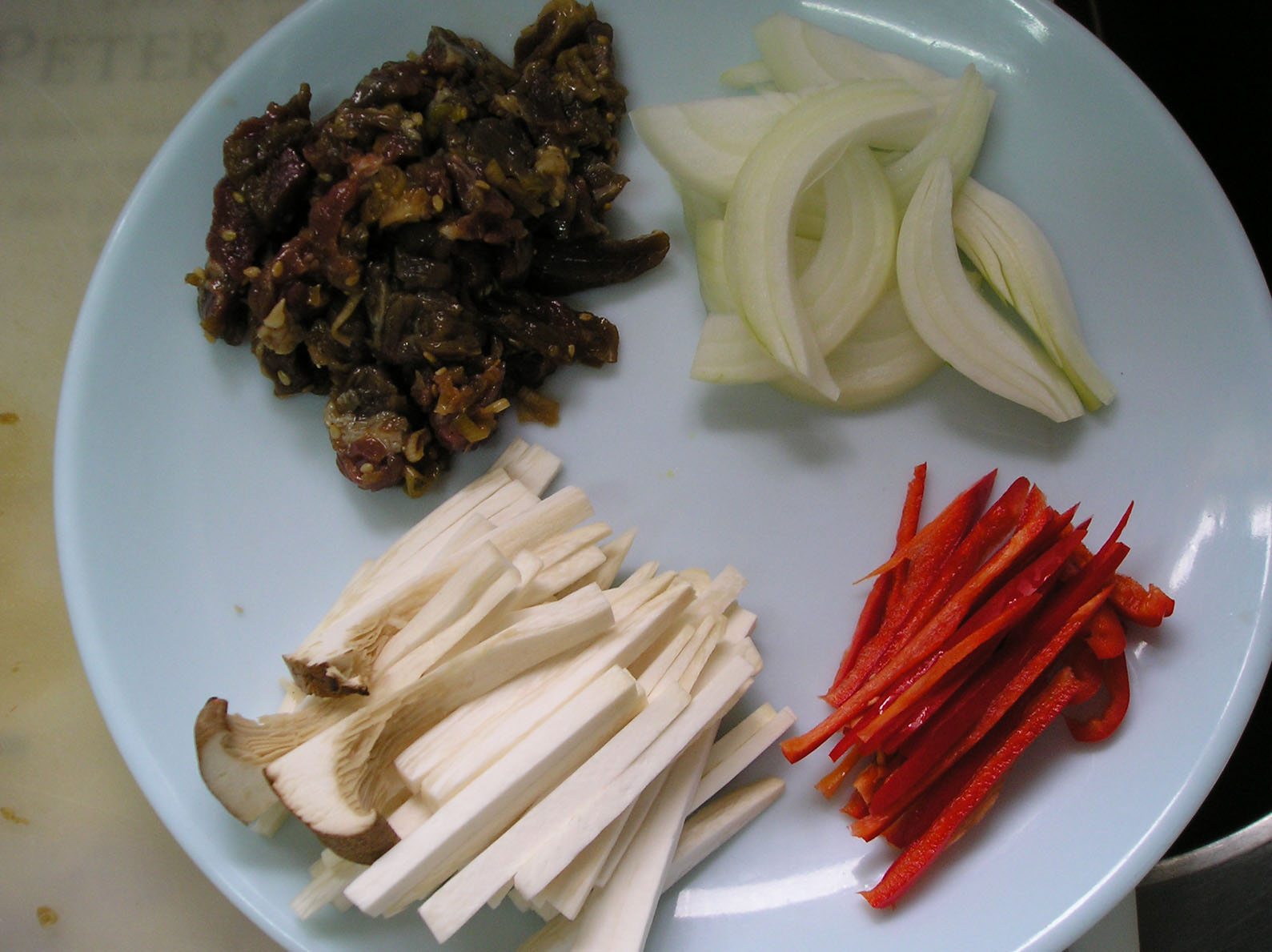 * 쇠고기를 길게 썰고 양파, 새송이버섯, 파프리카도 길게 채썬다.