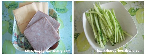 2.햄도 마찬가지로 얇고 넓적하게 잘라주시구요.오이는 가늘게 채썰어주시면 된답니다.