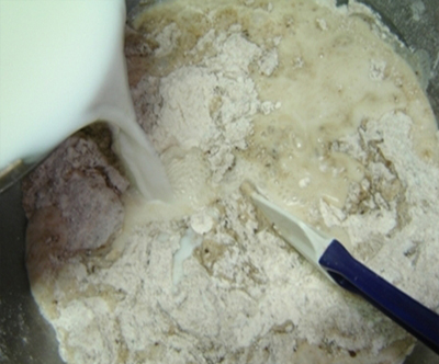 4.우유2컵과 물 11/2컵을 섞어 반죽을 해주세요..