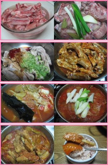 2.등갈비를 분량의 양념에 재웁니다.이때 김장김치를 다 씻어내면 양념을 좀더 분량대로 하구요.김장김치를 씻지않고 그대로 쓰려면 분량의 양념에서 좀 빼도 됩니다.(예를 들면 고추장이나 고추가루같은)