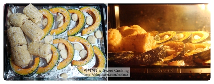 옥수수, 단호박, 마늘에 골고루 발라주었습니다.
