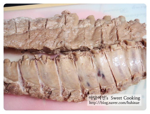 삶아진 돼지등갈비는 양념장이 잘 스며들 수 있도록