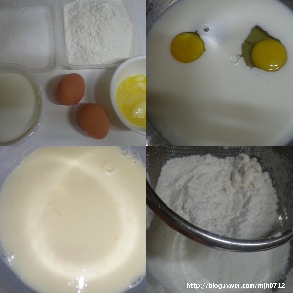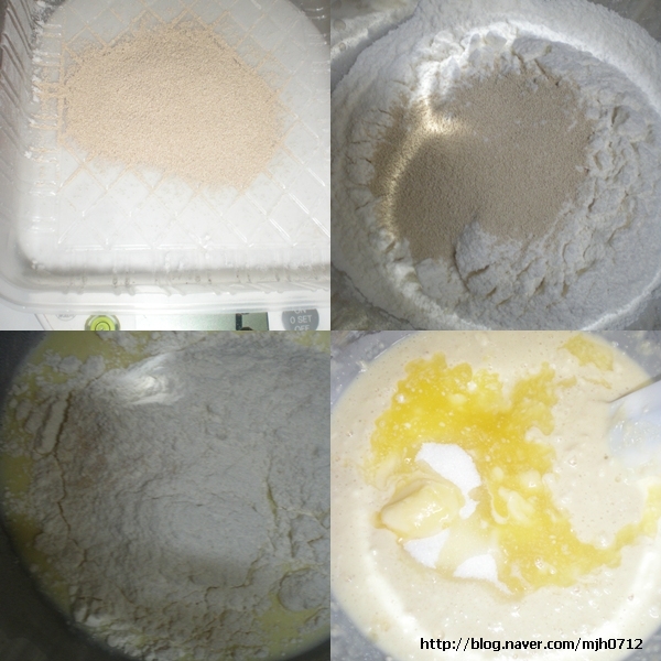 4. 그릇에 체친 가루와 이스트를 넣고 재빨리 섞은 다음 계란 섞은 우유가