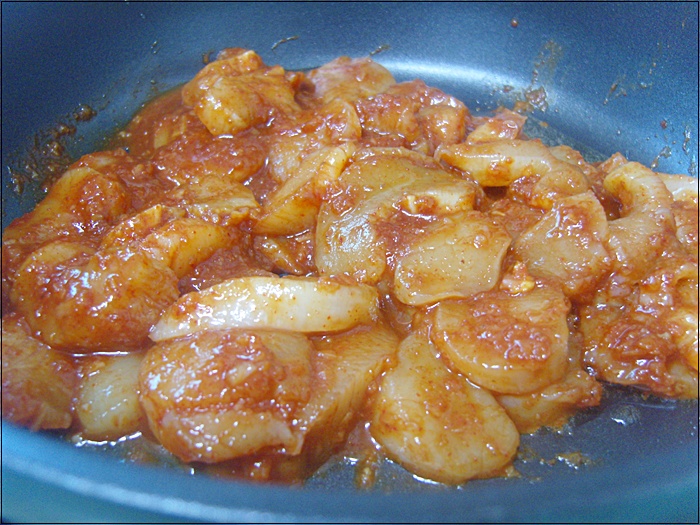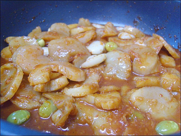달구어진 팬에 양념된 키조개를 넣고 볶아줍니다