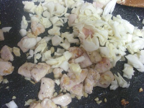 팬에 마늘을 넣고 볶다가 닭가슴살을 넣어 줍니다
