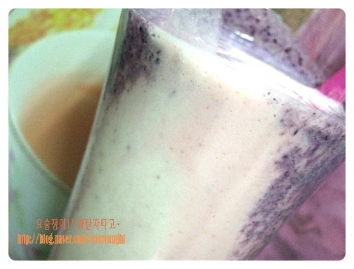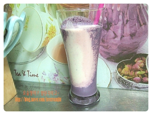 믹서기에 살짝 해동된 블루베리를 넣고 우유와 요구르트를 넣고 곱게 갈아준다