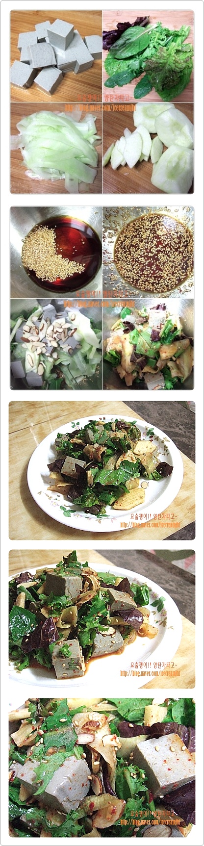 두부, 견과류, 채소, 검은참깨, 슬라이스아몬드, 쌈채소, 오이, 사과
