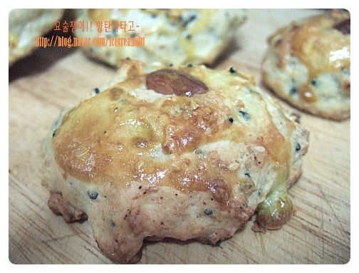 두부, 깨, 잣두부 80g, 박력분 100g, 중력분 20g, 달걀 반개, 올리브유 조금, 베이킹파우더 2작은술, 설탕 40g, 참깨.검은깨 약간씩, 통아몬드
