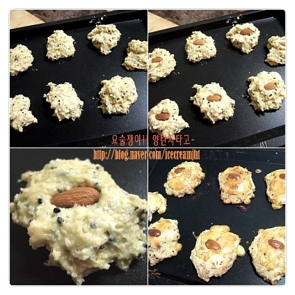오븐팬에 적당한 크기로 떼어 놓아주고, 통아몬드를 하나씩 올려 살짝 눌러준다