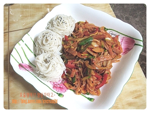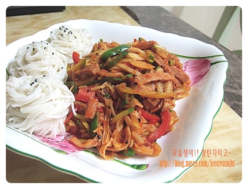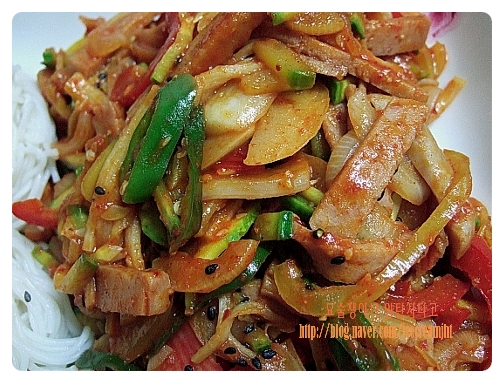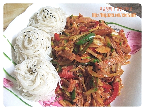 햄, 채소, 통조림햄, 호박, 풋고추, 맛살, 양파, 노랑.홍 파프리카, 감자소면