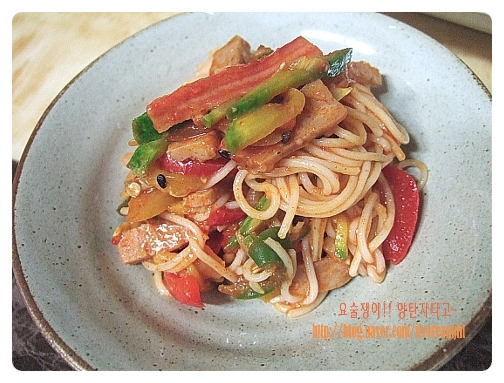 홍.노랑 파프리카도 채썰주고, 호박도 채썰어 준비한다