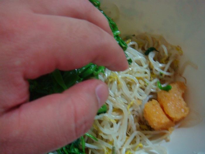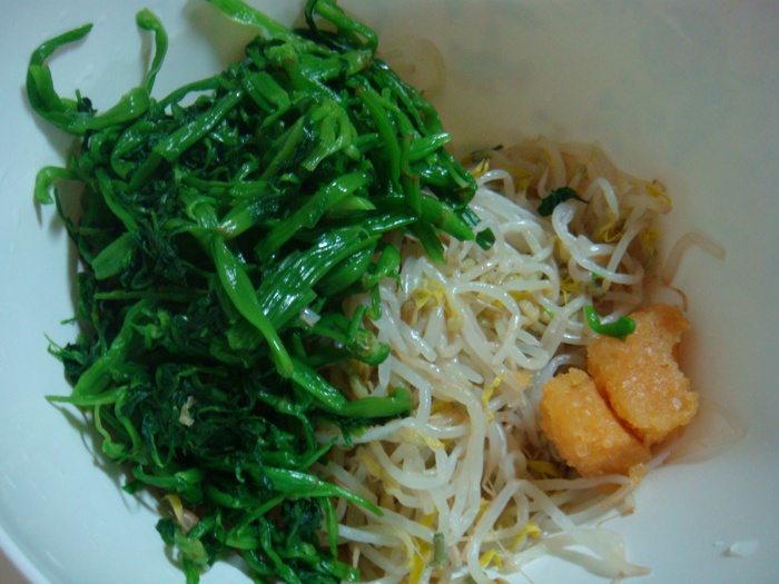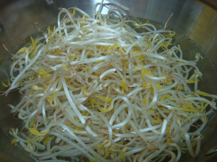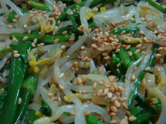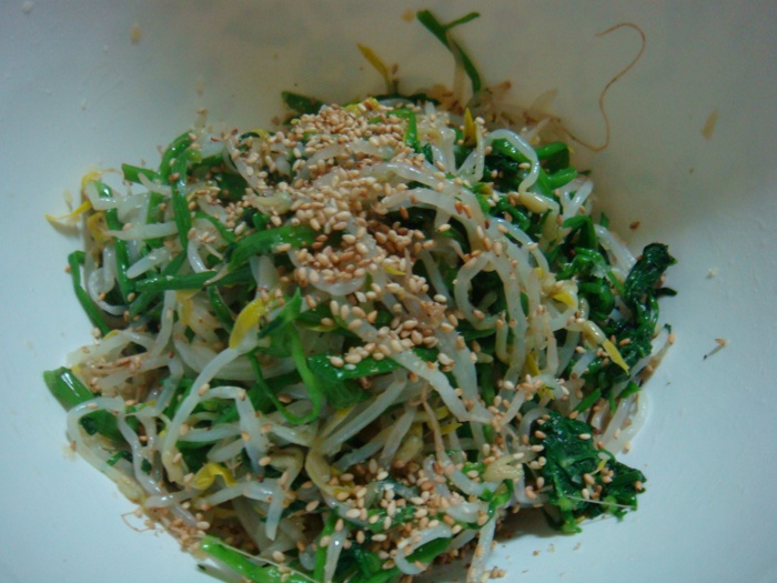 숙주 두줌, 미나리 두줌, 다진마늘 1t, , 참기름 1t, 참깨 약간, 소금 약간