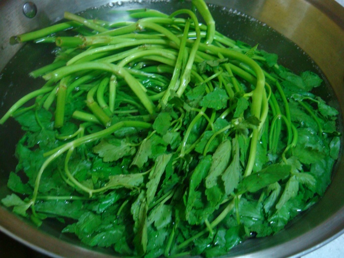 1) 숙주와 미나리를 삶은 물에서 데칩니다.