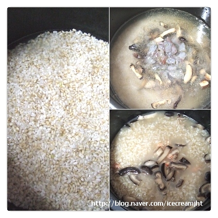 쌀은 깨끗이 씻어 솥에 담고 표고버섯 우린 물을 넉넉히 붓는다