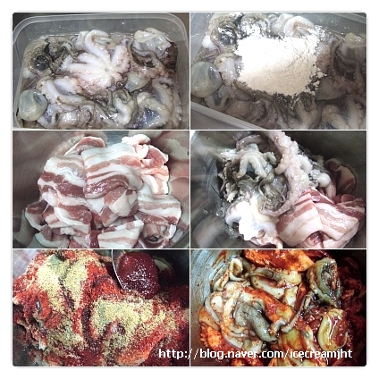 주꾸미는 머리속의 내장을 제거하고, 마른 밀가루를 부어 팍팍 문질러 불순물을 제거하고 깨끗이 씻어준다