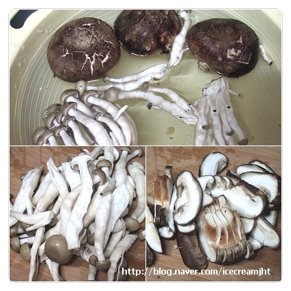 버섯은 흐르는 물에 흔들어 씻은후, 송이버섯은 손으로 찢고, 표고버섯은 얇게 슬라이스 한다