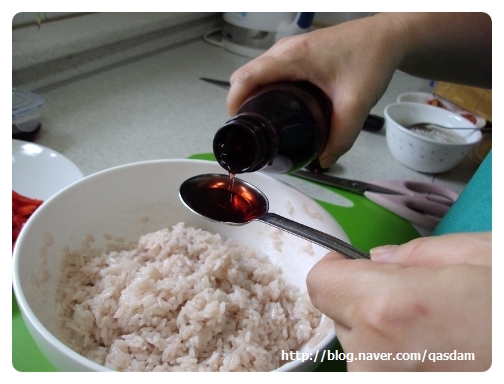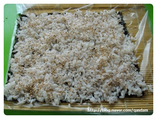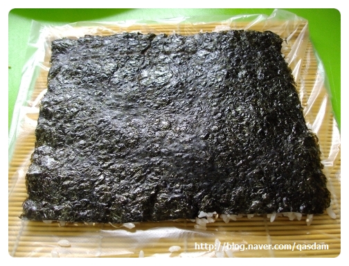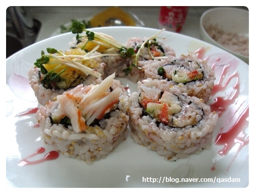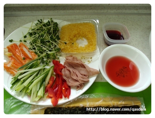 밥(3분의 2공기), 김(1장), 크래미맛살(작은것 2줄),아보카도(없어서 사용못함