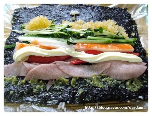 오이 당근 채썬것,무순,파프리카,단무지대신 무절여놓은거, 날치알, 마요네즈