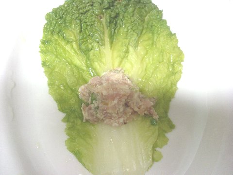 돼지고기 등심 2장, 배추잎8장,두부한토막,파다진것1큰술