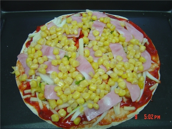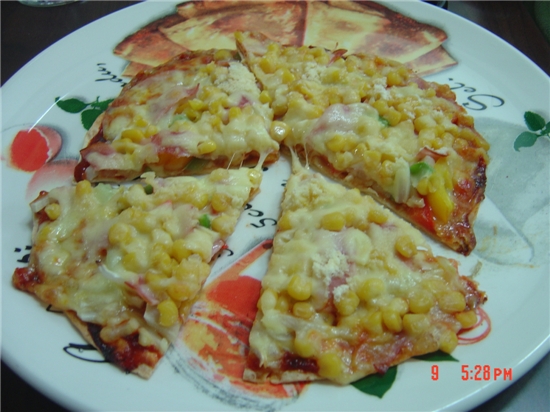 또띠아 베이컨 양파 모짜렐라치즈 캔옥수수 파프리카 , 스파게티소스 머스타드소스