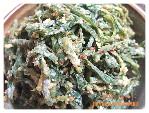 가루를 묻힌 부추를 찜기에 살살 넣어준후 뚜껑를 덮어 약불에서 20분간 쪄준다