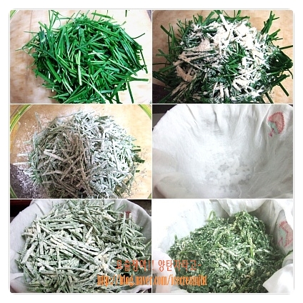 여기에 생콩가루를 부추에 넣어 고루 묻혀준다 (넉넉히 가루를 넣어 아주 고루 묻혀주세요)