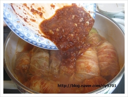 김치국물 (2/3컵)에 고추가루 2큰술, 맛술 2큰술, 마늘 1큰술, 설탕 1작은술, 참기름 약간, 소금 약간