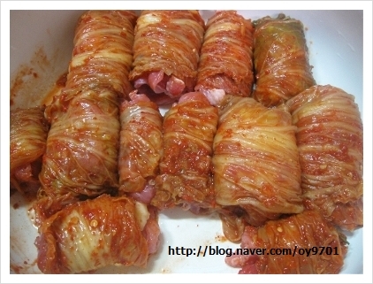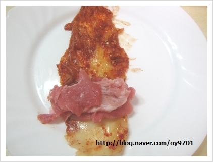 김치 한장에 뒷다리살 몇개 놓고 돌돌돌.. 말았어요..