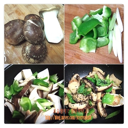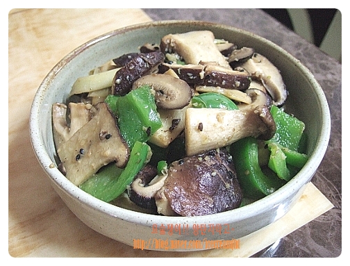 표고버섯, 새송이버섯, 피망, 버섯피망 (다진마늘, 들기름, 올리브유, 소금, 후춧가루, 올리고당, 참기름, 검은깨)