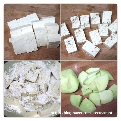 두부는 사각모양으로 썰어서 소금, 후춧가루를 살짝 뿌린후 마른 밀가루를 앞뒤로 묻혀준다