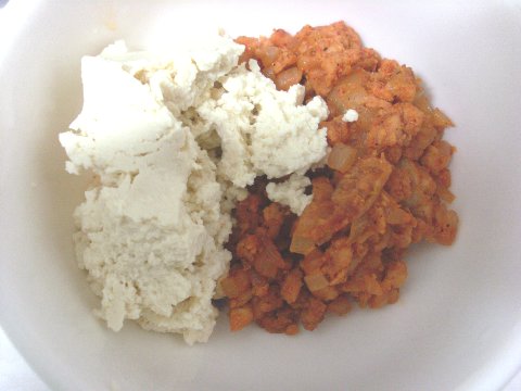 볶은 돼지고기는 볶은 분량의 반정도 되는 두부를 넣고 고루 섞으세요.