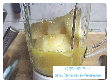 사과는 껍질을 벗기고 적당한 크기로 썰어 블렌더 유리용기에 넣어준다